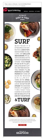 For the first time ever, Red Lobster was introducing Surf & Turf to their menu. Since this was a departure from strictly seafood, we needed to convince customers that the same craft and passion for food would go into their steak. With an eye-catching, long-scrolling email, we showed customers there’s much more to Red Lobster’s Surf & Turf than meets the eye.