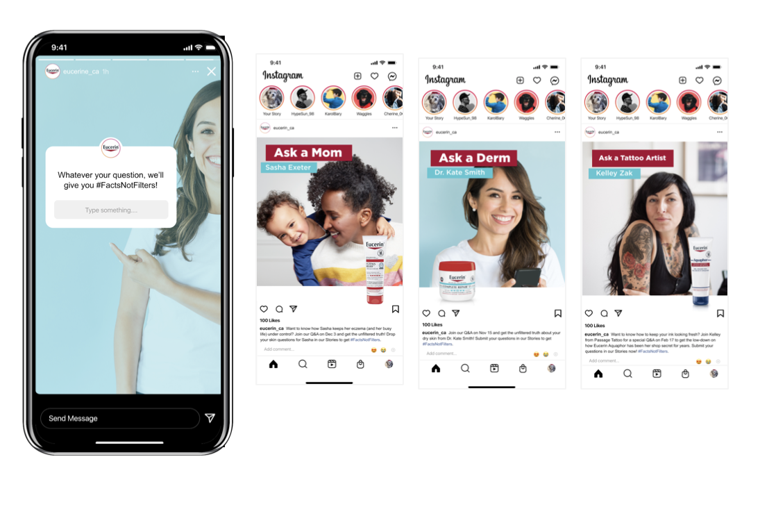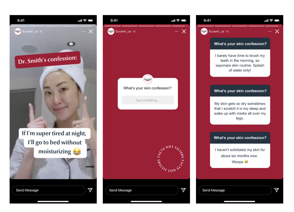 An influencer takeover prompts people to submit their unfiltered “Skin Confessions”. Through real-time engagement we'll remind users that real skincare isn’t perfect, and that they're not alone in their skin issues.
