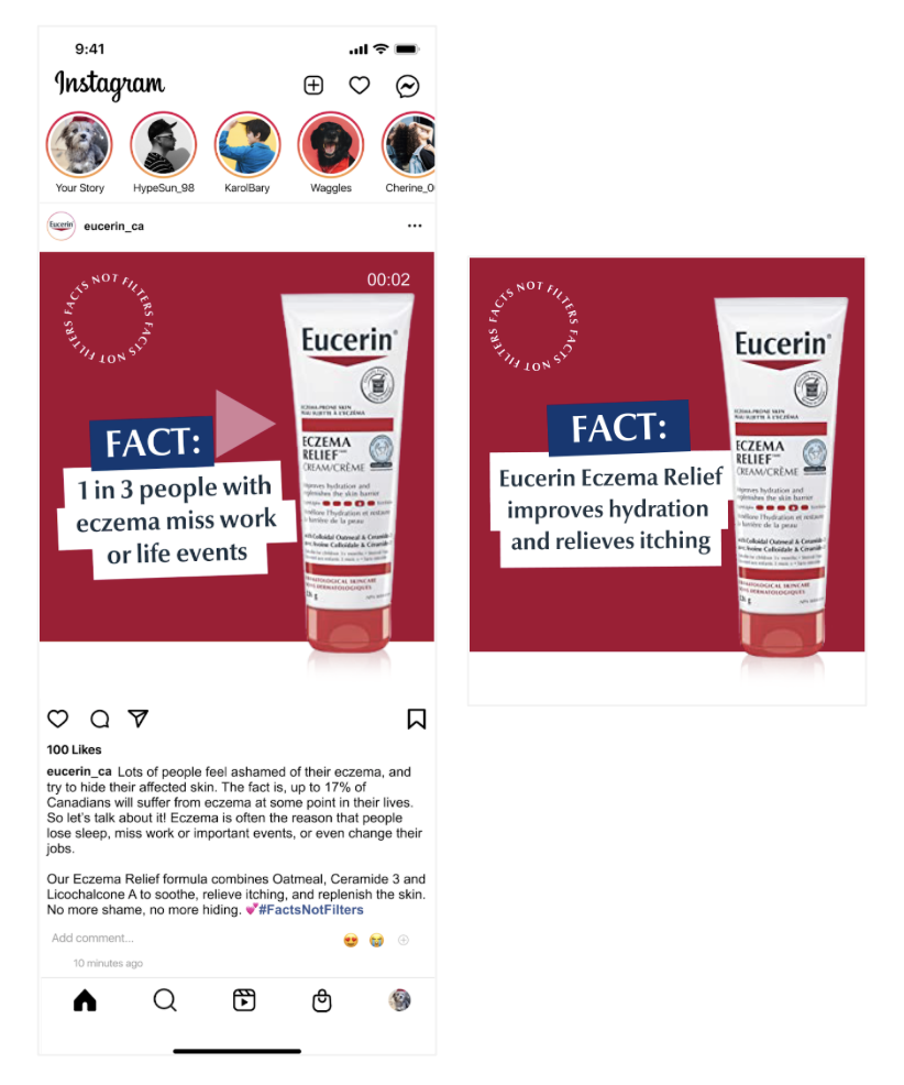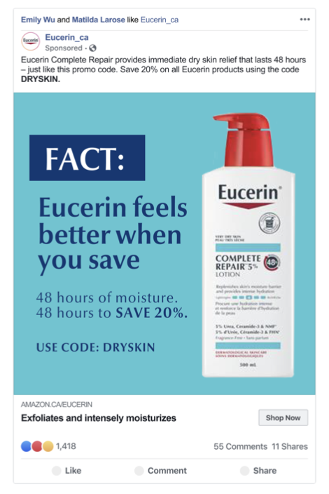 To highlight Eucerin’s long-lasting 48-hour moisture, we’ll create a FB post with a promo code that’s only good for 48 hours.