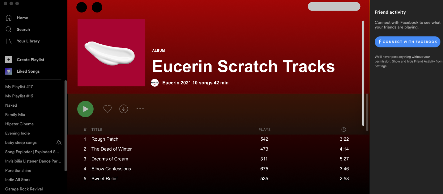 We launch Scratch Tracks, the first Spotify playlist inspired by the sounds of skin. Using ASMR audio of skin being scratched or cream being applied, it’s a white noise album that helps listeners stay focused, while breaking the stigma of dry skin.
